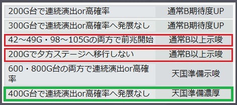 「400G台で連続演出or高確率へ発展なし」だった場合は天国準備濃厚なので当たるまで打つ